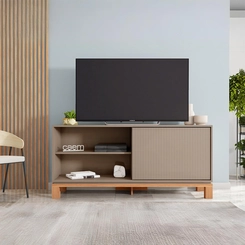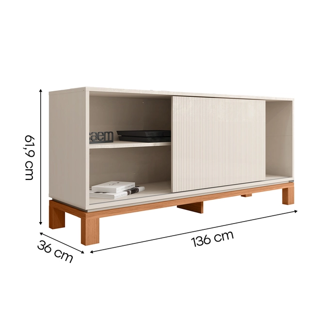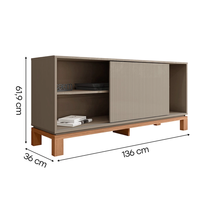 Com design contemporâneo, ela combina linhas minimalistas e textura microrripada na porta de correr, adaptando-se facilmente a diversos estilos de decoração. Os pés em cavalete com base elevada proporcionam leveza visual e facilitam a limpeza do ambiente.