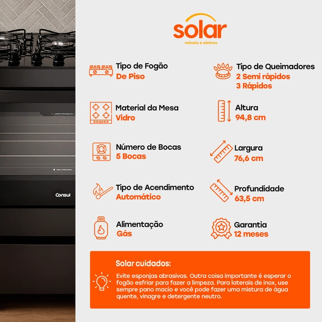 Na Solar, dá pra levar o Fogão Consul 5 Bocas Glass CFS5VBE com Acendimento Automático!