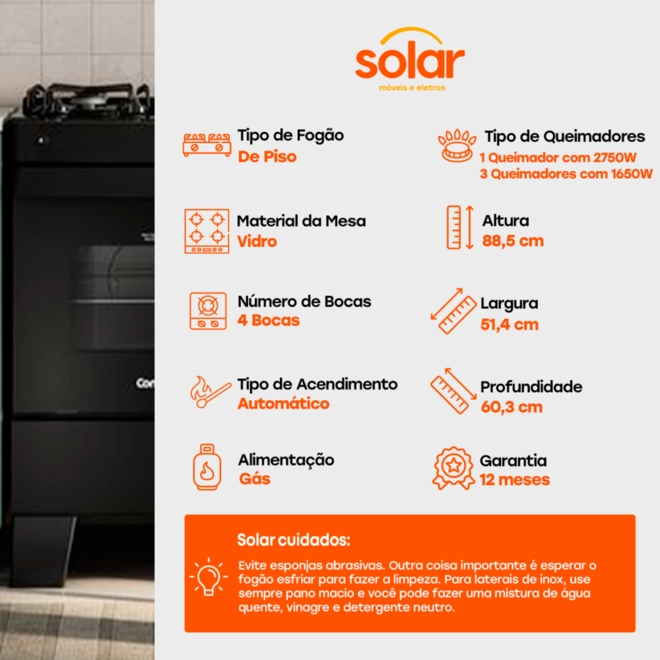 Na Solar, dá pra levar o Fogão Consul 4 Bocas com Mesa de Vidro e Acend. Automático CFO4VCE!