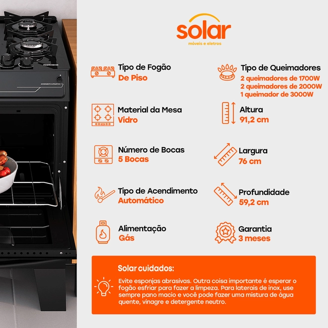 Na Solar, dá pra levar o Fogão Itatiaia 5 Bocas Electra Glass Plus Acendimento Automático!