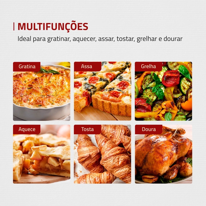 Multifunções: Ideal para aquecer, cozinhar, tostar, assar, gratinar e grelhar de maneira rápida e eficiente.