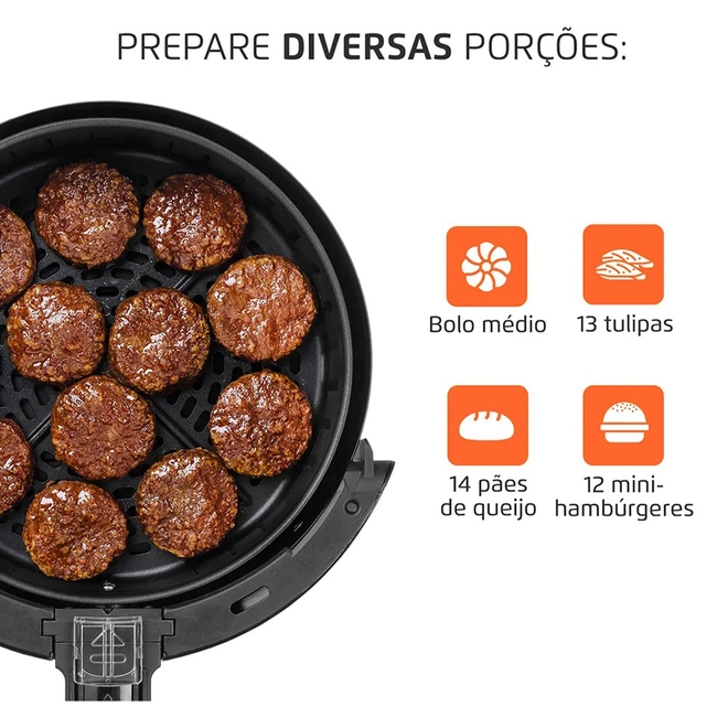 Vai muito além da batata frita! Prepare também carnes, peixes, lasanhas, pizzas, legumes, bolos, pudins e muito mais.