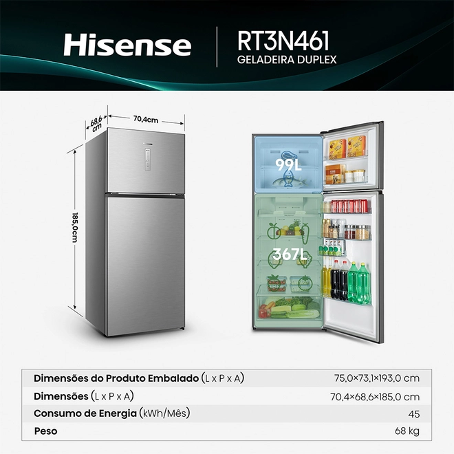 A Geladeira Hisense RT3N461NAC3 traz o equilíbrio perfeito entre espaço interno, tecnologia avançada e um design moderno que transforma qualquer cozinha. Com 466 litros de capacidade, ela é ideal para famílias que precisam de mais armazenamento e praticidade.