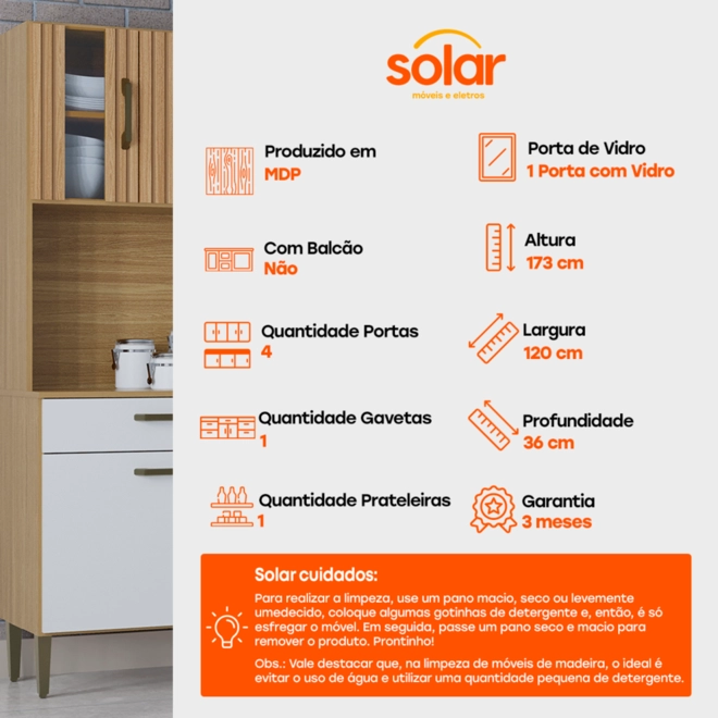 - 4 portas com dobradiças metálicas, sendo uma com detalhe em vidro, que traz mais charme ao ambiente;