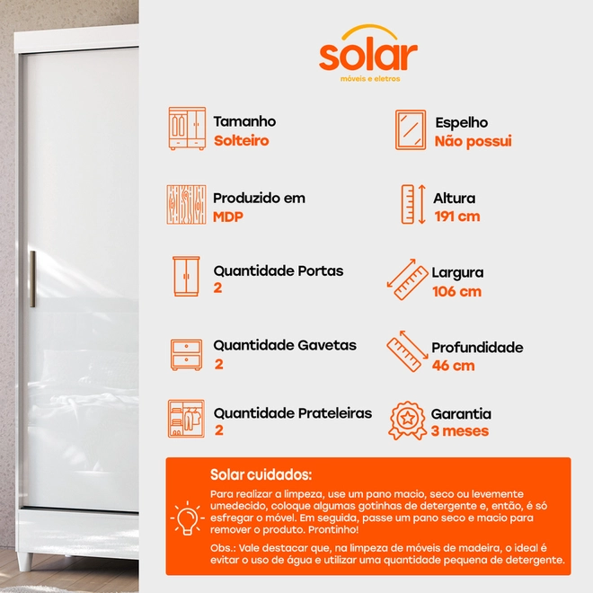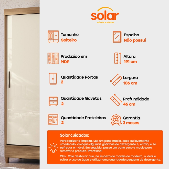 Na Solar, dá pra levar o Guarda-Roupa Solteiro Santos Andirá Fit 2 Portas de Correr 2 Gavetas!