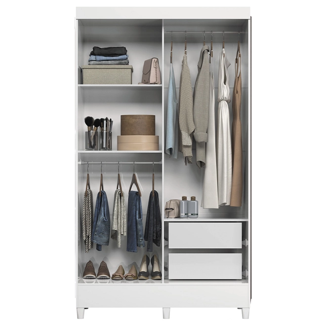 Amplas prateleiras internas, perfeitas para organizar roupas dobradas, calçados e acessórios.