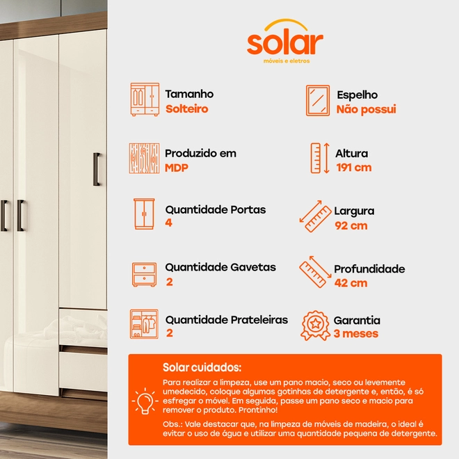 Na Solar, dá pra levar o Guarda-Roupa Solteiro Santos Andirá Fit 4 Portas 2 Gavetas!