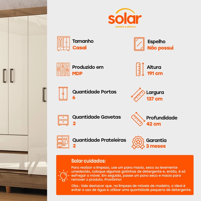 Na Solar, dá pra levar o Guarda-Roupa Casal Santos Andirá Fit 6 Portas 2 Gavetas!