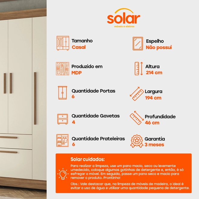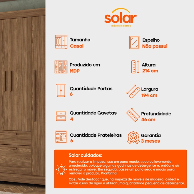 Na Solar, dá pra levar o Guarda-Roupa Casal Santos Andirá Guarapuava 6 Portas 4 Gavetas!